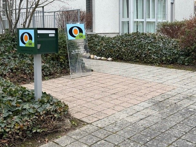 Fahren Sie am grünen Briefkasten mit dem Logo vorbei.